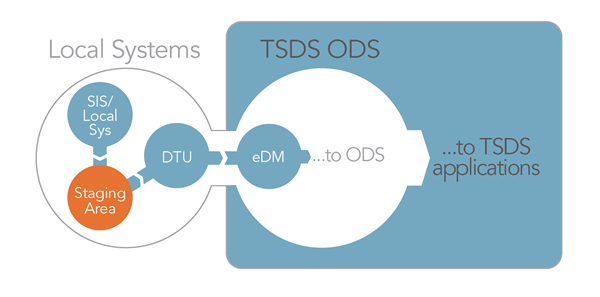 The Staging Area is a designated folder in a server at the LEA or ESC (see the orange circle below). When TSDS's Data Transfer Utility (DTU) is installed on the same server, the Staging Area allows users to send data to the TSDS system.